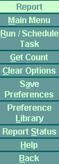 The menu options to create a report are as follows: Main Menu - This option returns to the main menu. Run/Schedule Task - This options starts the report generation process. Get Count - This options returns a count of the number of records which meet the filter criteria. This option is not available for any of the summary notice counts reports templates. Clear Options - Clears all the fields on the page and resets it to the defaults. Save Preferences - Saves the current configuration options for use at a later time. Saving configuration options allows for repetitive executions of a report without having to specify the options each time. Preference Library - Allows the user to retrieve a saved preference file or delete an existing one. Clicking on the check mark icon Report Status - This option takes you to the report status page where you can see the status for both processed or scheduled reports. Help - This option displays Help for Reports. Back - This option takes you back to the previous page. Click on the Job Options link below for the next step